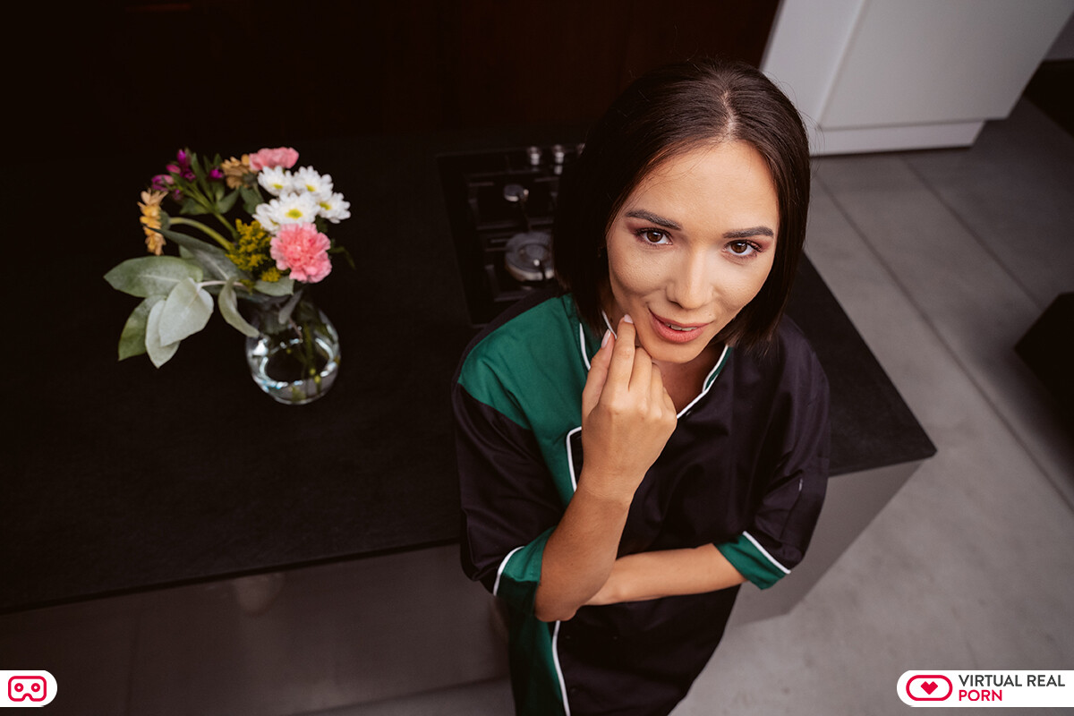 Eve Sweet and you are doing the housework of the owner’s home, who are not there now. After finishing cleaning some things, they realize that the owner is not coming back soon. Eve, looking at you with her lustful eyes, tells you: “Do you know what we can do better than resting?”. You know perfectly what she means: you can have sex in the house. She takes off her clothes and sits naked on the kitchen counter. She teases you with her beautiful feet, because she knows you are into that. Then, she gives you a soft footjob right before kneeling to give you a blowjob, sticking your cock in her mouth. She turns around and you fuck her from behind while she bends against the counter with her leg up. Then, you go to the sofa and she rides you in cowgirl position. She gives you another footjob there, and you help her with your hands until you cum.