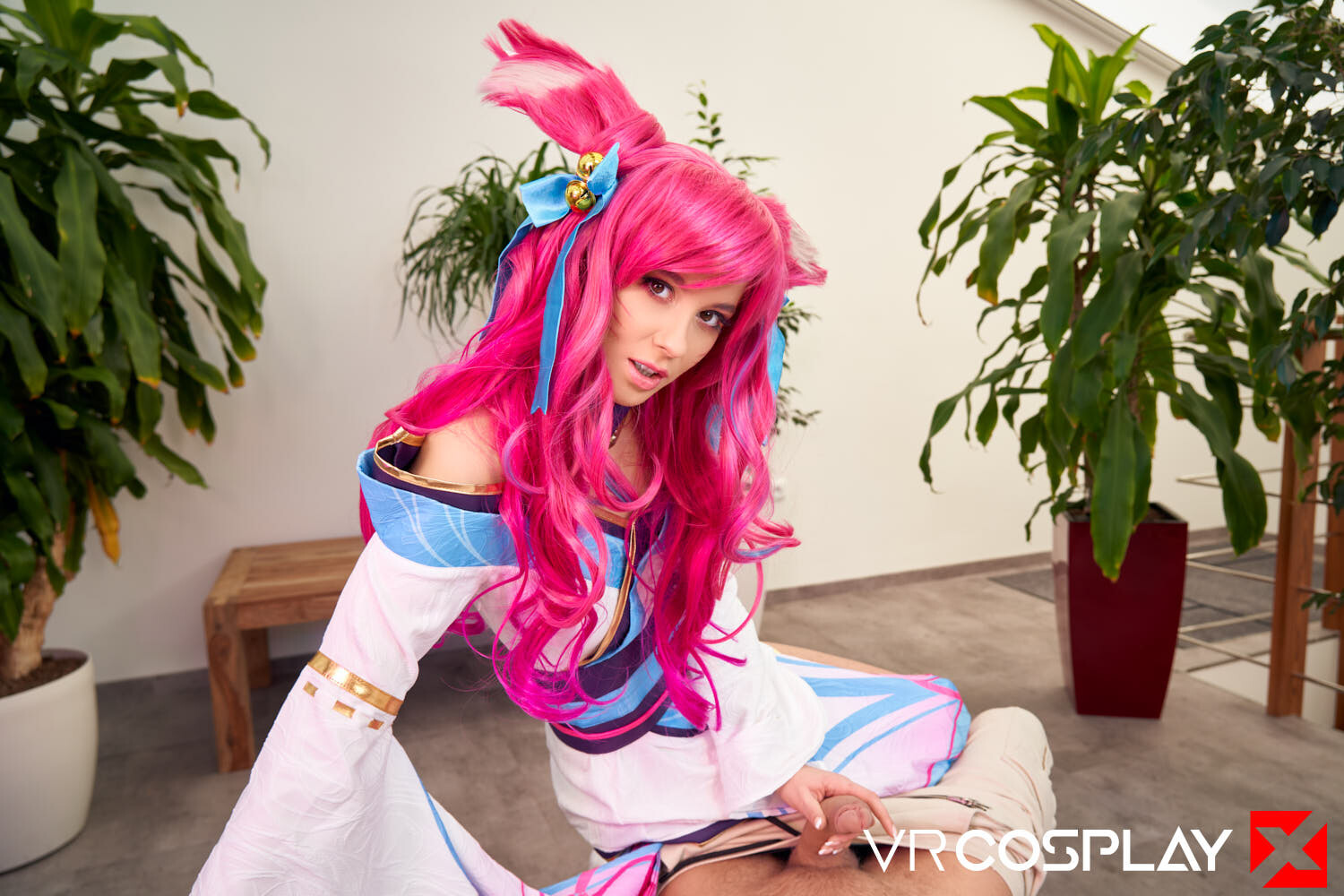 You've been captured by a savage and mysterious fox-like vastaya. She is the famed Spirit of Salvation and the fox all mortals are beckoned towards when their souls arrive at the spirit realm. She is offering you the chance to find your final satisfaction. Her skin reminds you of cherry blossoms, her tiny dress hiding her juicy ass is tempting, and her amber-golden eyes, as she gets down on her knees right in front of you, are enough to make you hard. Grab your Quest 2, Vive, or Valve Index, and fuck Eyla Moore as Spirit Blossom Ahri from League of Legends in our new 180-degree stereoscopic vrporn cosplay parody only on VRCosplayX.