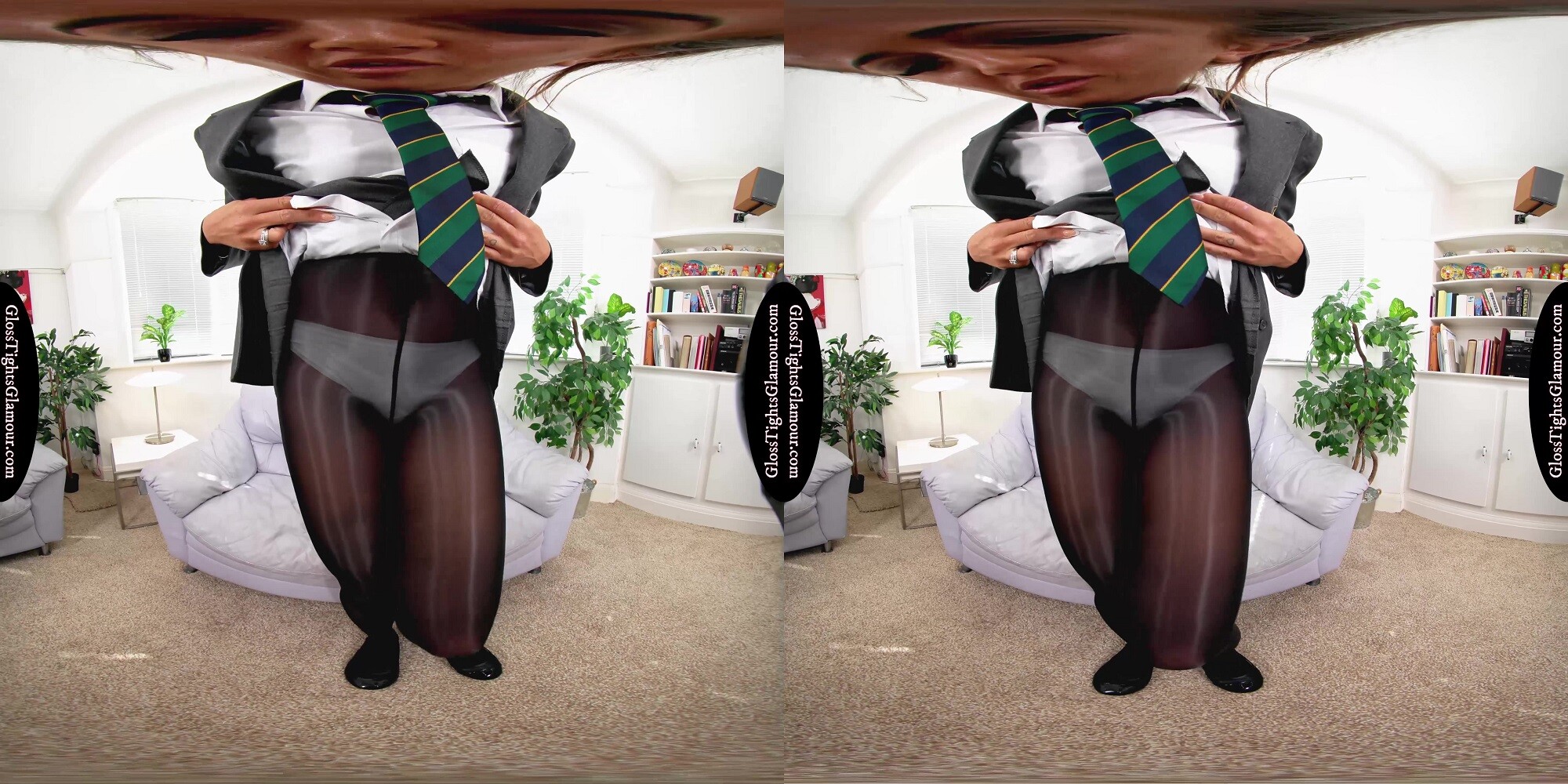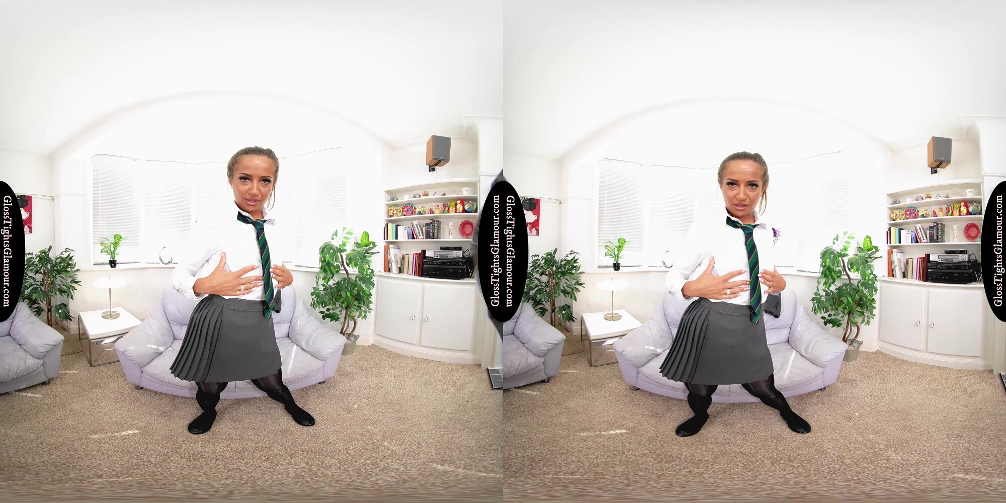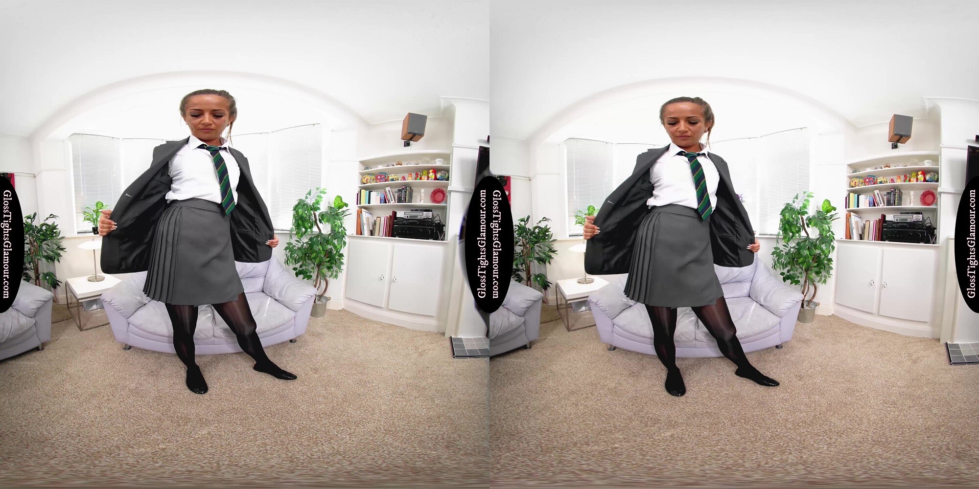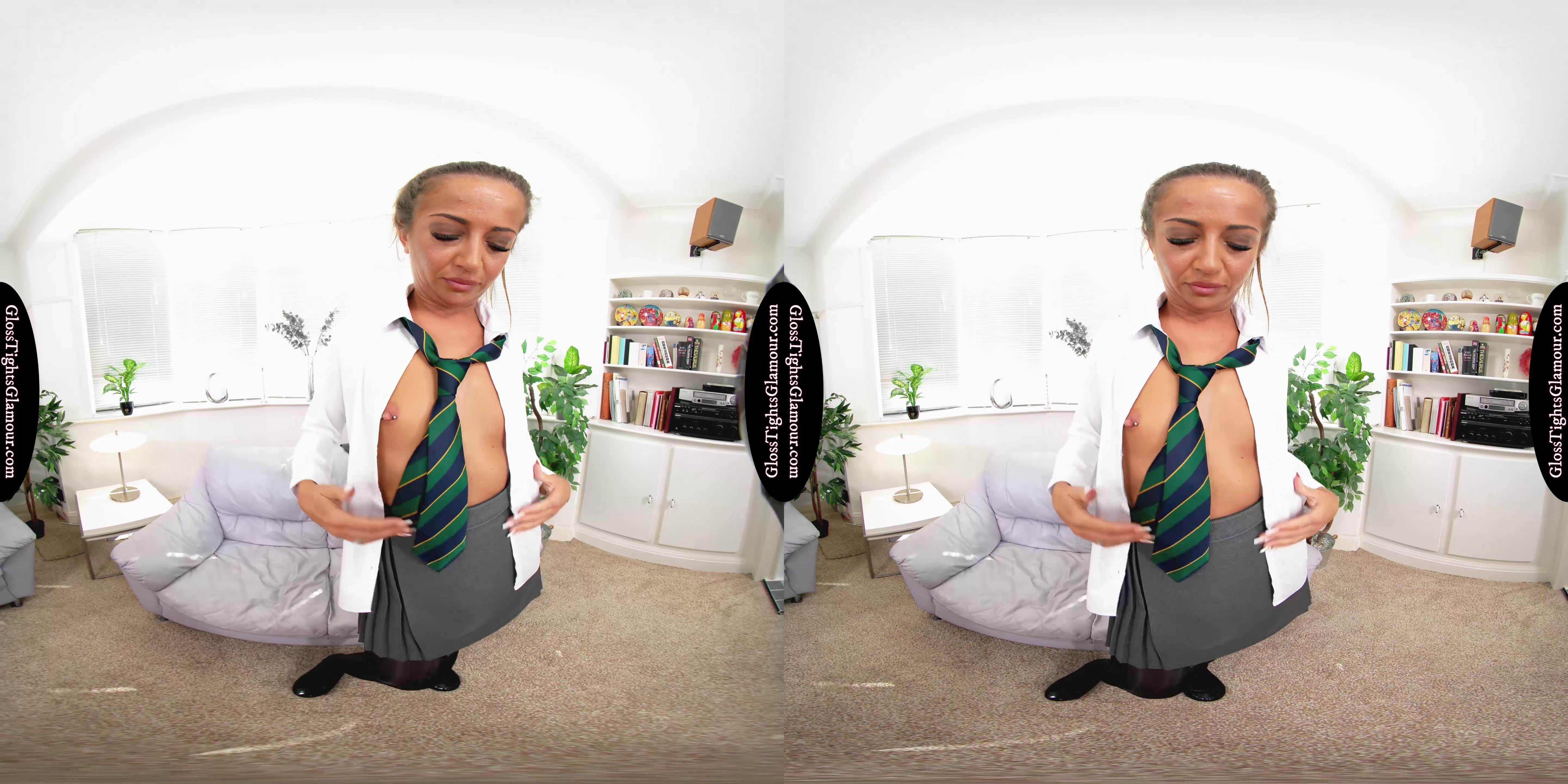 8K 60fps VR Video from shoot with Lara Lee wearing a college uniform outfit comprising: grey blazer, white shirt & college tie (sans bra), grey pleated skirt, black sheer glossy legwear with white fullback cotton briefs/panties underneath, and black ballet flat footwear that is removed to show off toes/feet, in a glorious tease to naughty nude that provides a closer inspection of her tights/pantyhose, and much more besides – with vocal encouragement for you to show your appreciation toward the end!