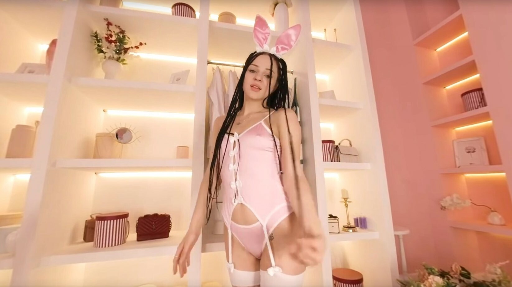 The way she plays with every glance and gesture, it’s like she knows exactly how to build that tension. When she starts with the slow reveal, it’s pure fire, dude. The sitting pose, the way she locks eyes through the camera—it feels so damn real, like she’s right there with ya.