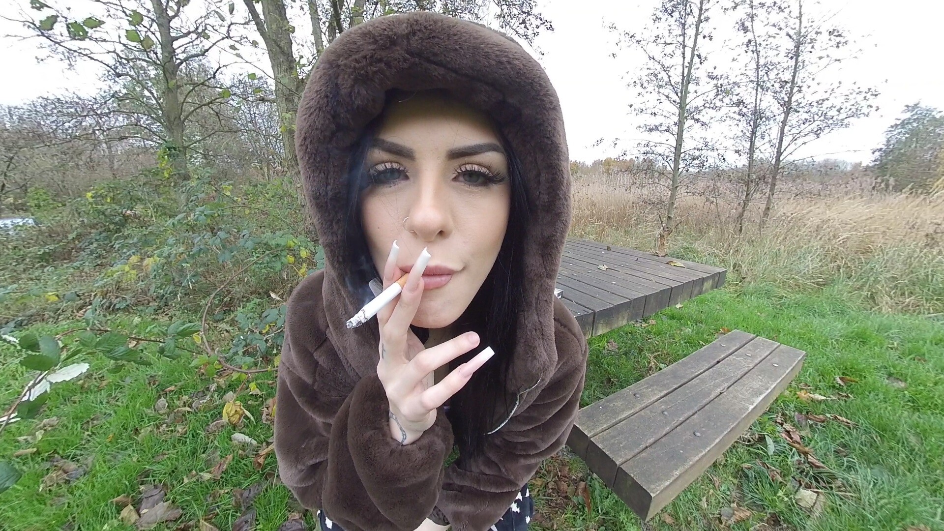 Stunning smoker Pussykat cuts and tears her clothes off for you while smoking 2 cigarettes for you.