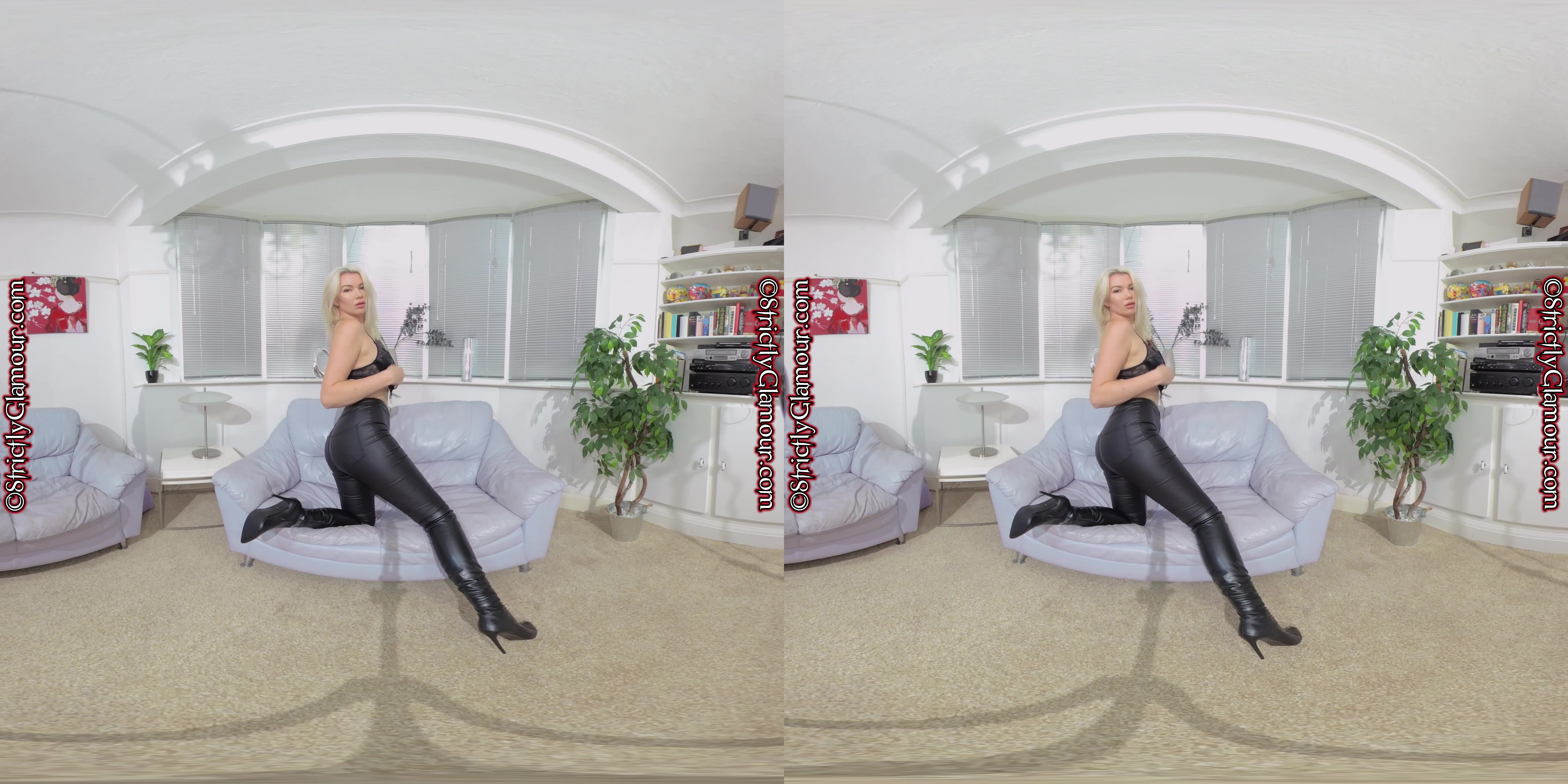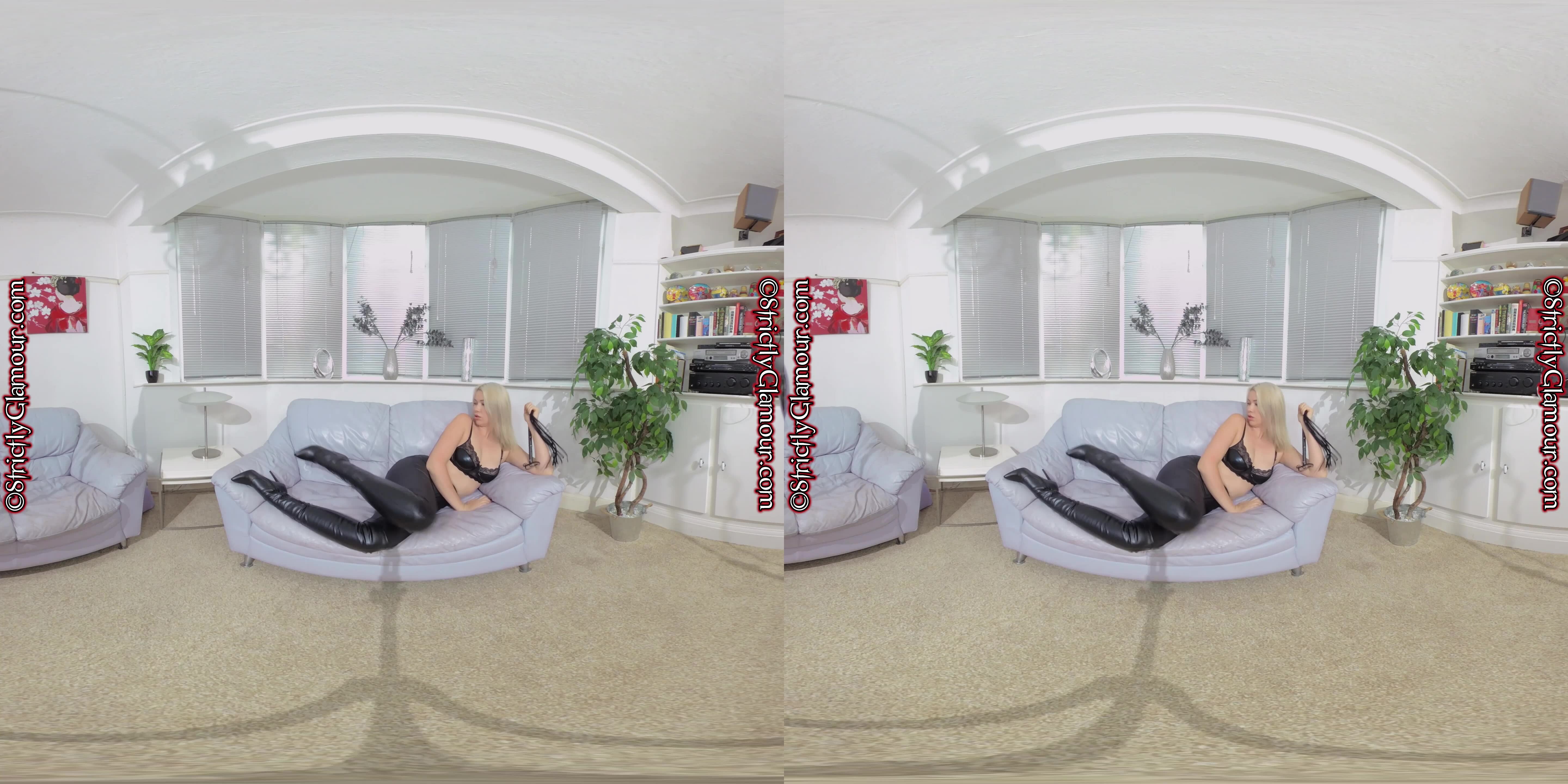 8K 60fps VR video featuring Mistress Liz Rainbow who steps forward with spanking in hand wearing a black pvc peephole bra, black pvc mini/micro skirt with side laces/ties, black pvc high-heeled over-the-knee...