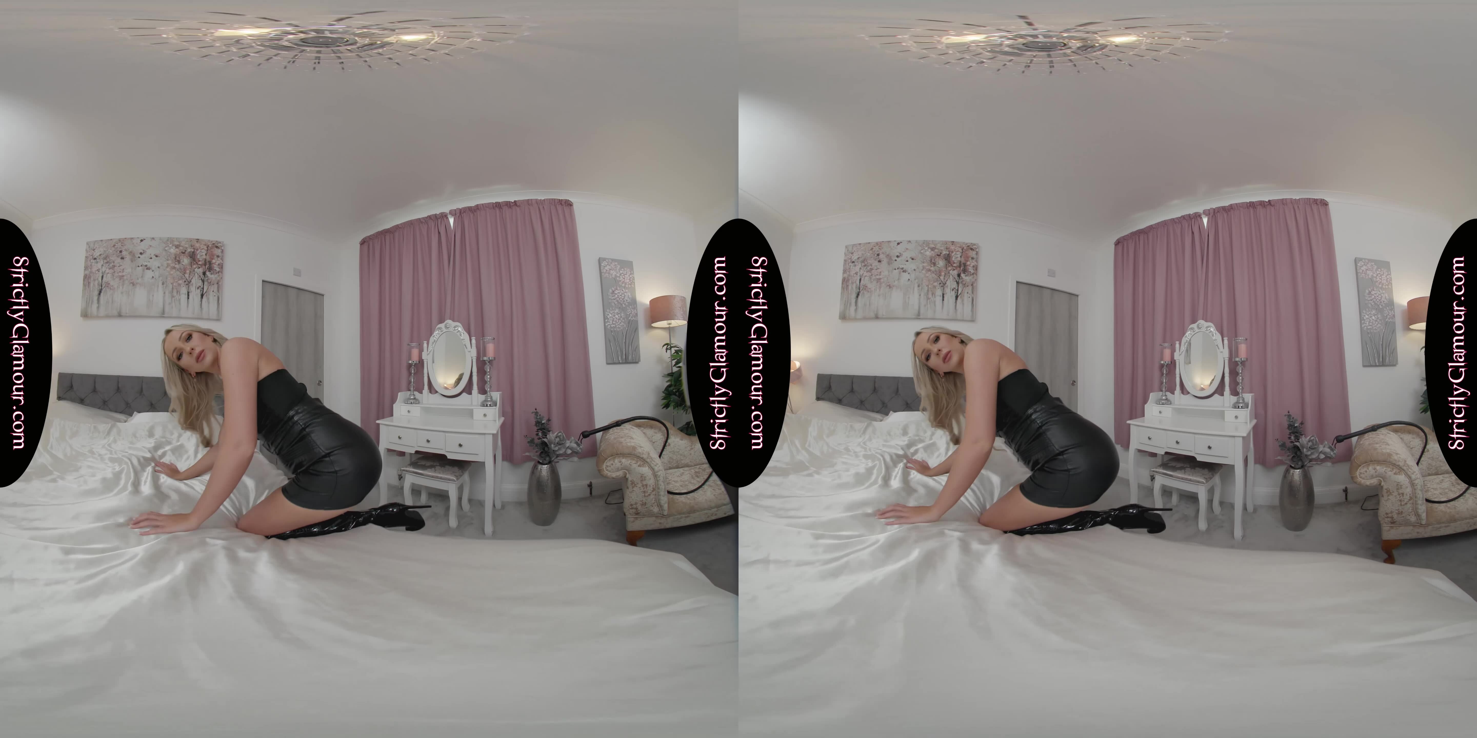 8K 60fps VR video featuring Mistress Liz Rainbow who steps forward with spanking in hand wearing a black pvc peephole bra, black pvc mini/micro skirt with side laces/ties, black pvc high-heeled over-the-knee...